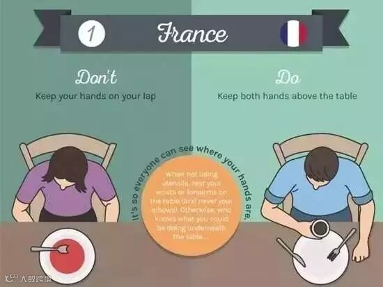 吃饭的时候不要把手放在腿上,要把双手都放在桌面上。尽管你的双手可能没有在使用餐具,但是要别人看到你的手是一个礼貌的行为。
