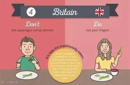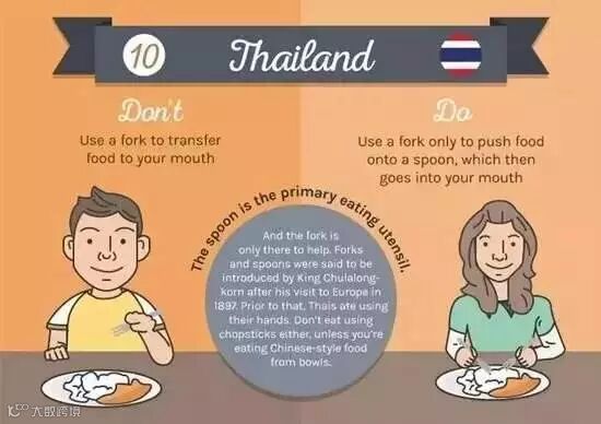 不能用叉子将食物送到嘴里,只能用勺子来吃饭。勺子才是主要的进餐用具,叉子只是用来把食物推到勺子里。同样在泰国也不用筷子,除非是在吃碗装的中餐时。