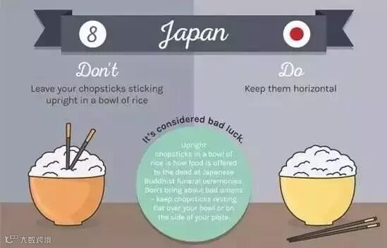 不要把筷子插在饭上面。只有在佛事上,供奉给死者的米饭上才能插筷子,这被认为是很晦气的事。 ( 当然,在中国也是这样要求的,也许是对中国文化延续的结果 )