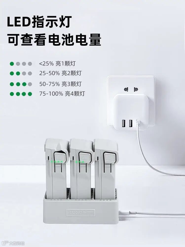 无须将电池放到无人机上,随时随地查看电池电量,电池接入充电管家,按下功能按钮即可查看电池电量,无需接线