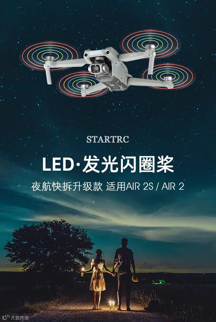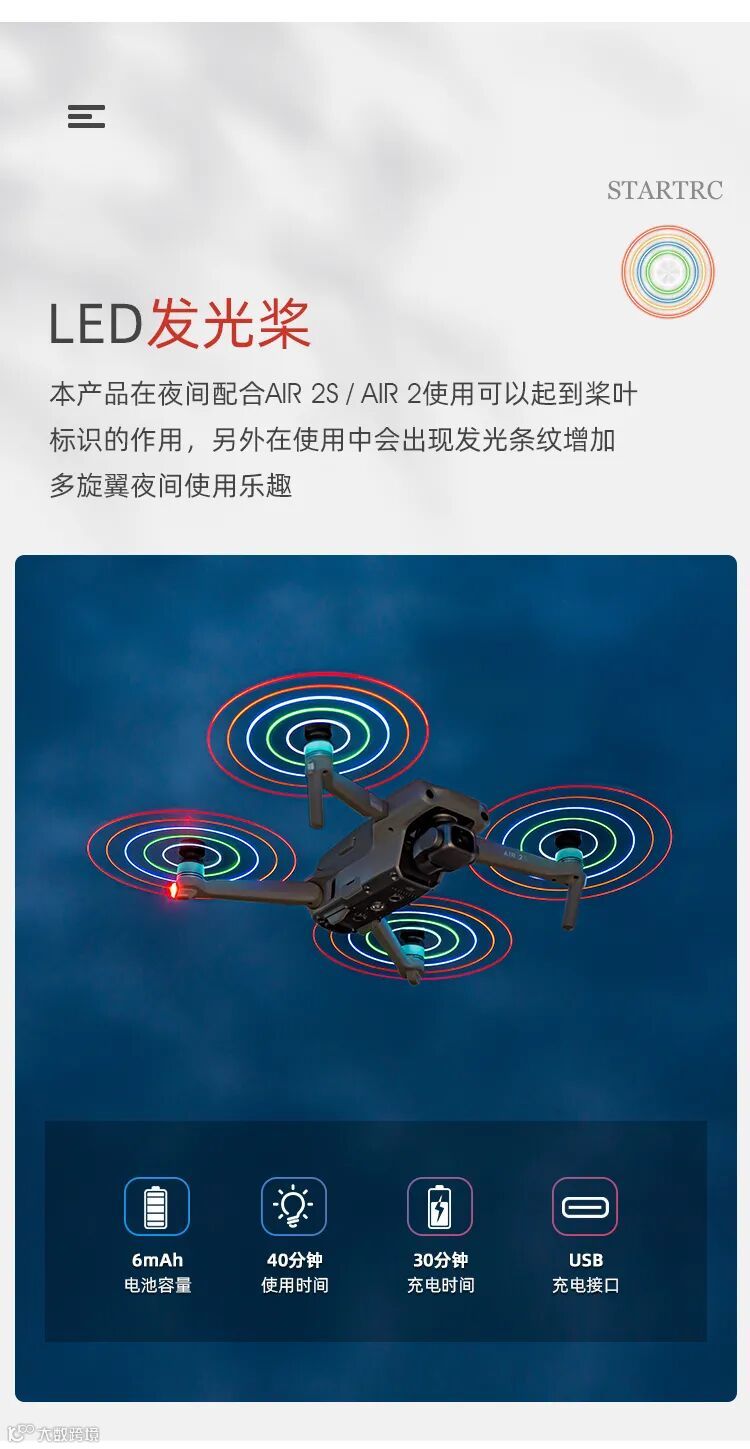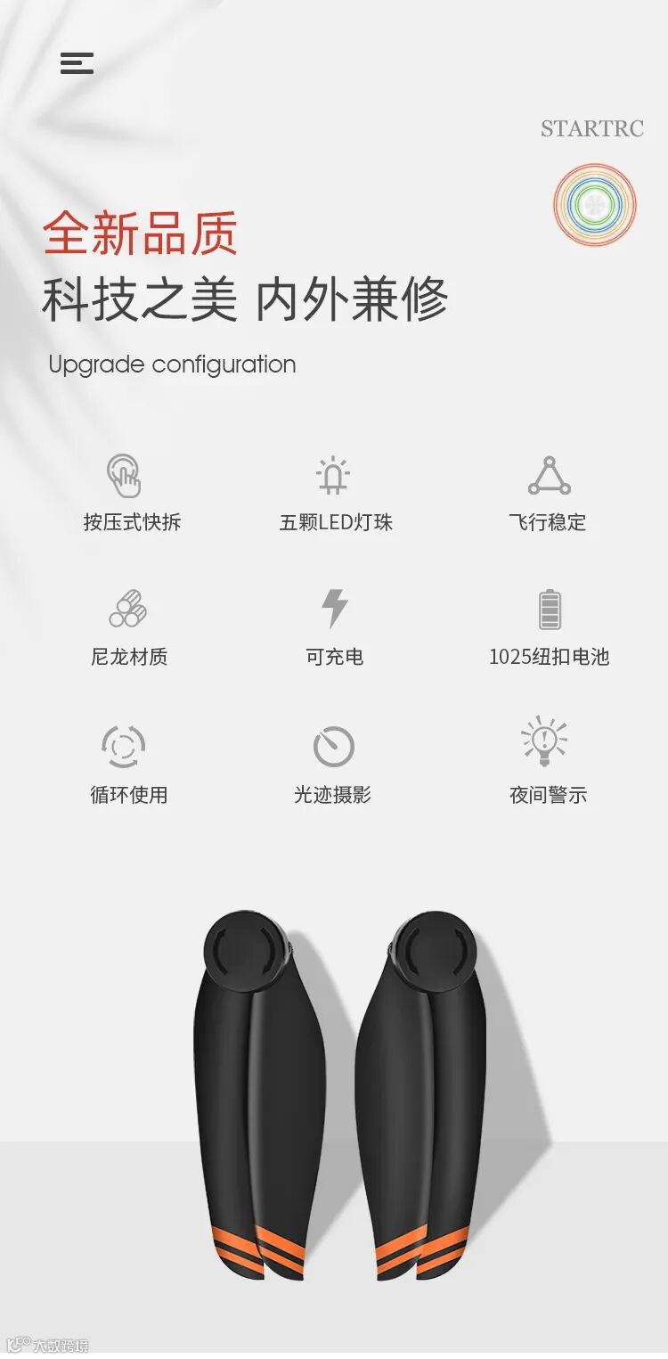LED发光闪圈桨,作为STARTRC无人机配件之一,这是一款加入了五颗LED灯珠的设计理念,在夜空中能发出绚丽多彩的炫光,给天空增加美的同时,也是夜航警示灯,是不是很高贵别样呢?