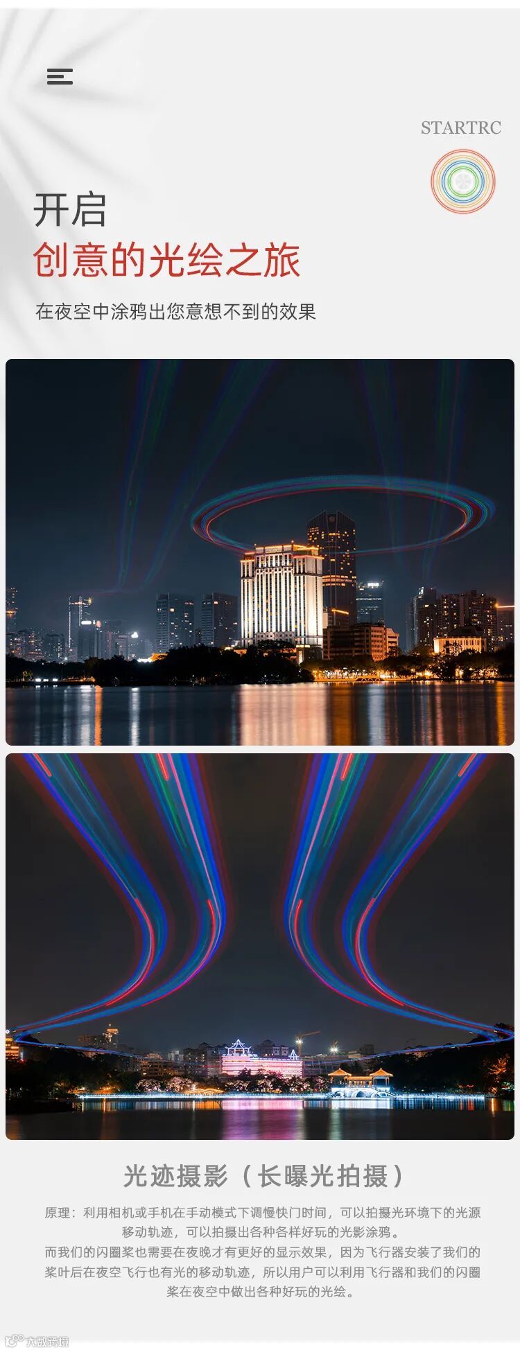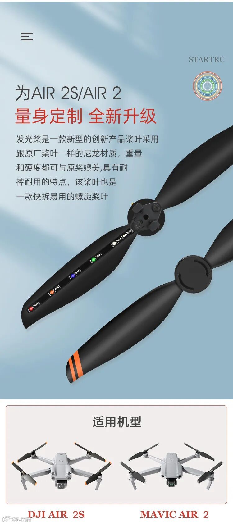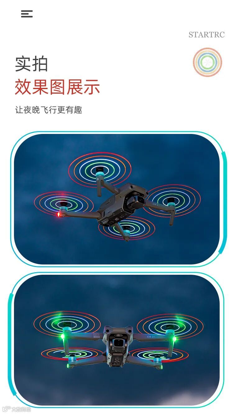 LED发光闪圈桨,作为STARTRC无人机配件之一,这是一款加入了五颗LED灯珠的设计理念,在夜空中能发出绚丽多彩的炫光,给天空增加美的同时,也是夜航警示灯,是不是很高贵别样呢?