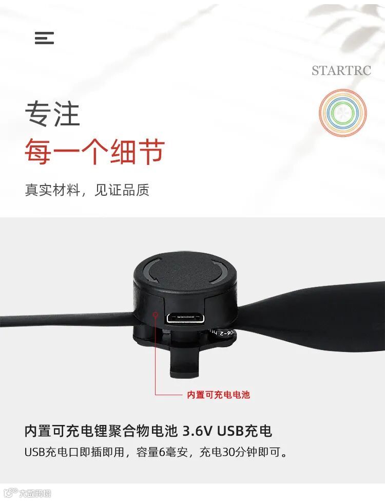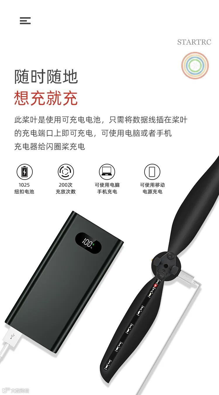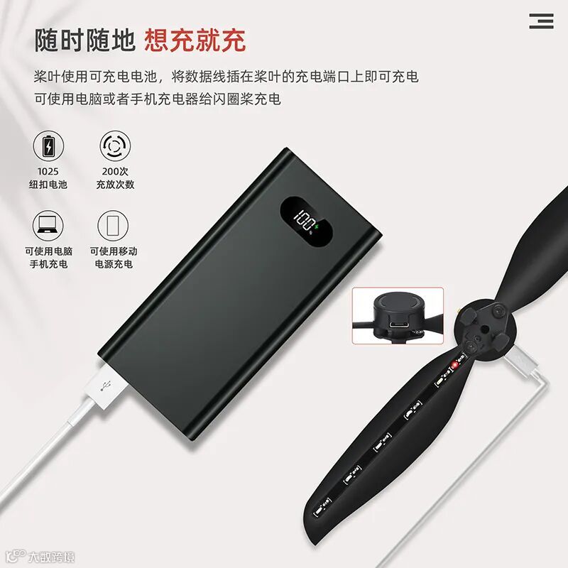 桨叶使用可充电电池,随时随地想充就充,充放次数200次