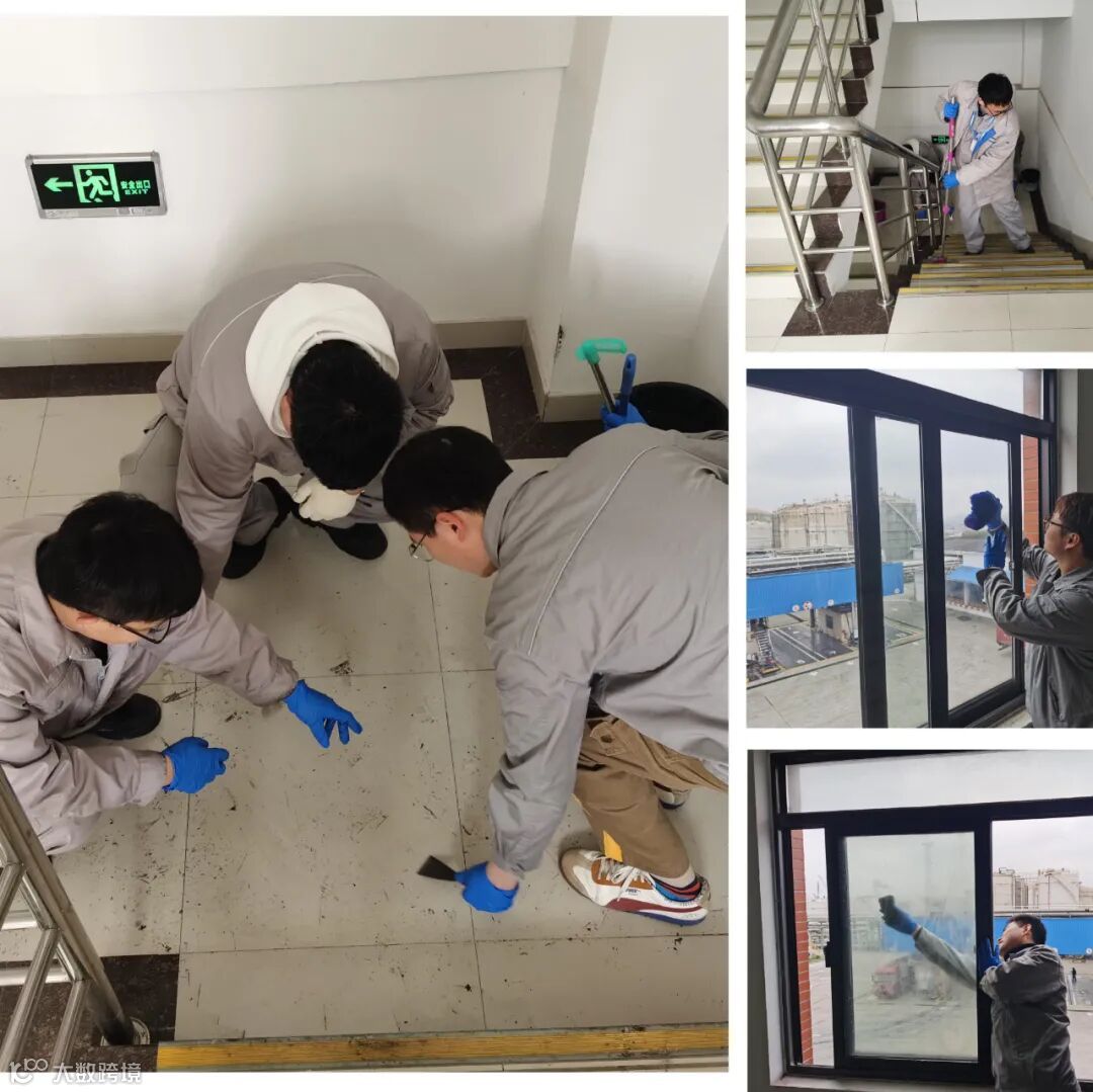 上午9时许,团员青年们带着扫把、拖把、水桶、抹布、劈刀等工具到达四号楼。四号楼由于长时间无人使用,楼梯台阶、扶手、窗户上早已满是灰尘,面对如此灰尘弥漫的境况,团员青年们发挥不怕脏、不怕累的精神,分工合作,不曾放过任何一个角落的半点污渍。