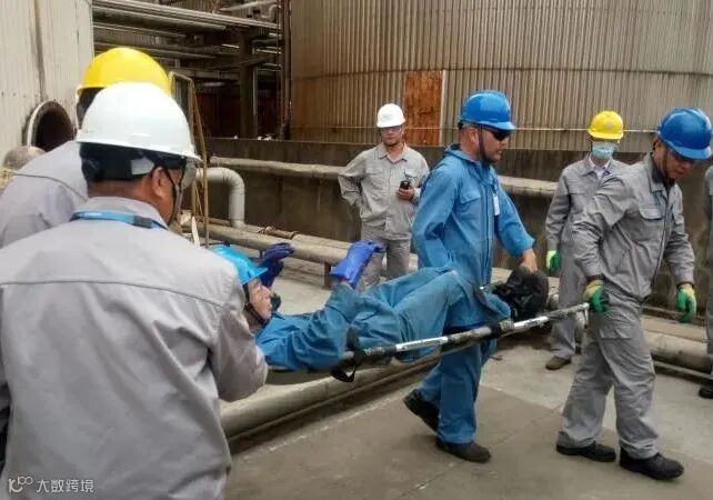 应急处置演练模拟在T-1205罐清罐过程中有一名员工在罐内窒息晕倒,随即仓储物流部启动公司综合应急预案三级应急响应,班组人员有的穿戴空气呼吸器入罐救援;有的准备担架;有的报告部门领导;有的联系120……现场救援工作按照处置方案井然有序展开。