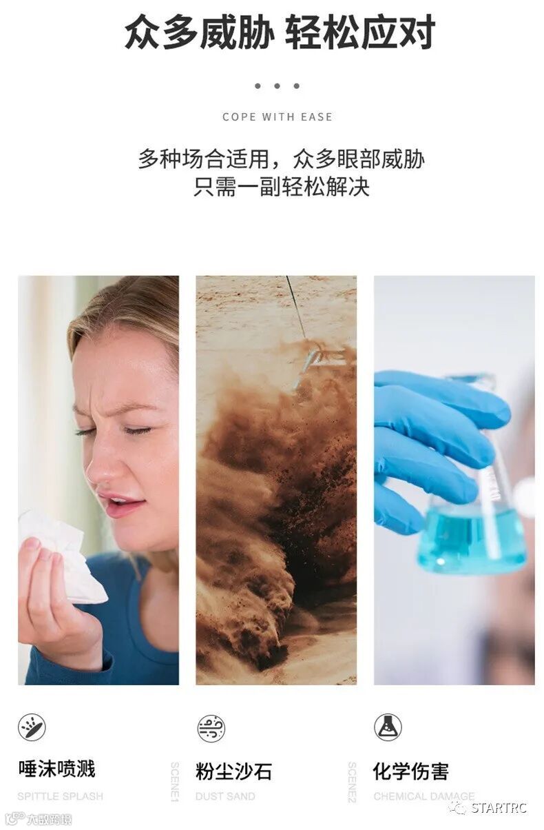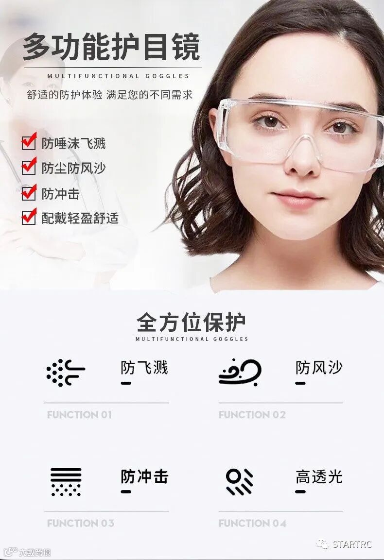 疫情期间出门防护装备,就要越实用越好,护目镜就是防护一种装备,手部没有消毒千万不要接触眼口鼻,而护目镜作用防止一些飞沫或血液等飞溅到脸部,因而对眼镜有保护作用。日常做饭防油烟也很实用