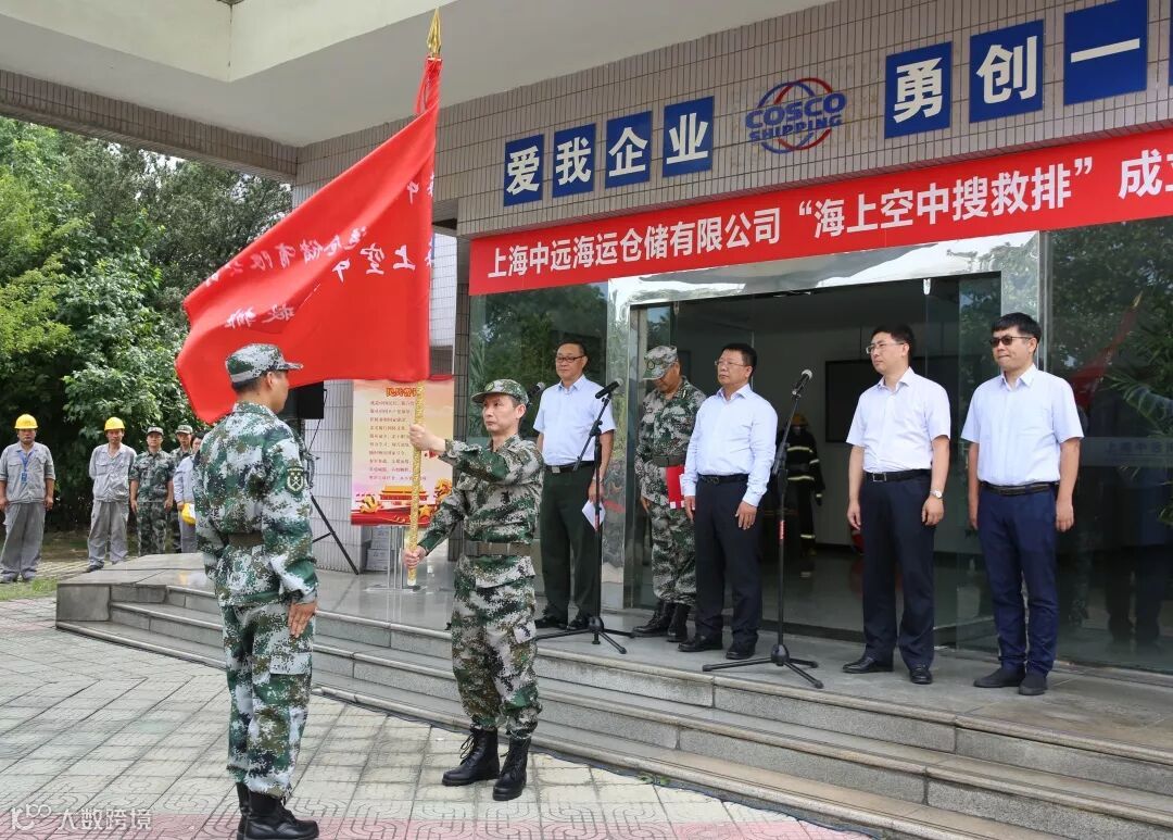 为履行国防义务和责任,助力企业安全生产运营、提高专业队伍管训水平,在纪念中国人民解放军建92周年之际,7月31日上午,海运仓储举行“海上空中搜救排”成立仪式,上海中远海运总经理、人民武装部第一部长赵邦涛,党委书记、人民武装部政委蔡震洲出席仪式。蔡书记对“海上空中搜救排”提出三点希望:一是要按照警备区要求抓好民兵整训。二是要参照准军事化标准抓好日常管理。三是要贴近企业生产经营提高质量效益。