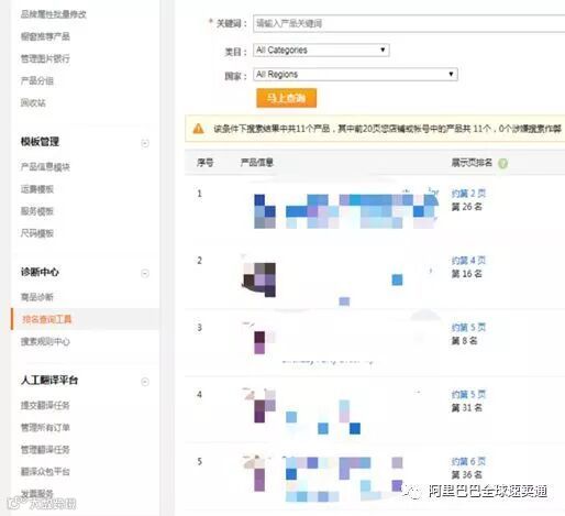 前面说到增加关键词曝光的宽度,是不是问题就解决了,显然没有。如果曝光的关键词权重不够,没有靠前的排名,依然得不到足够的曝光。我们要兢兢业业做的事情是----提升每个和我们产品相关的关键词的权重,也就是做到曝光的深度。平台有个很好用的查询关键词排名的工具,路径是产品管理----诊断中心----排名查询工具,一般来说,只要是我们的产品在某个关键词的排名没有在前5页,我们就会把这个关键词加入直通车推广,积累权重;反之则在直通车中删掉该关键词。产品关键词排名查询如图所示: