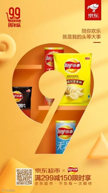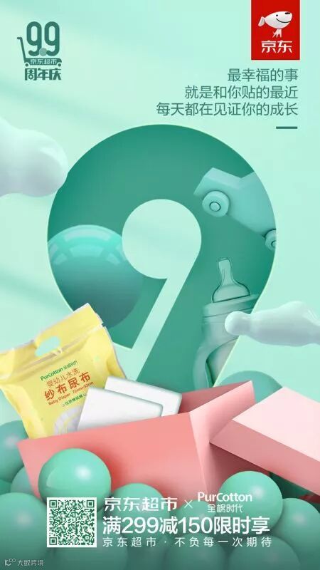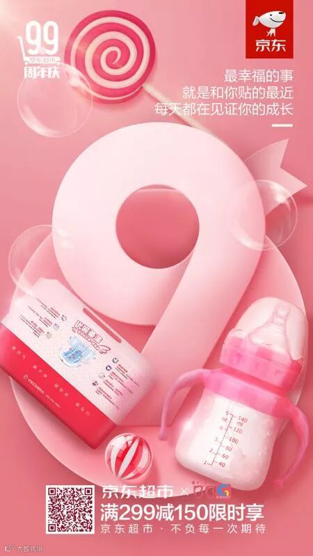 海报结合品牌和产品元素进行创意设计,文案通过融合产品的自身特点以宠溺的口吻将品牌态度传递给消费者,海报传递的不仅仅是京东超市周年庆的信息还有对消费者的情感,触动消费者的内心深处。而通过官方渠道发布为京东超市庆生,能逐步扩散至平台的千万用户。