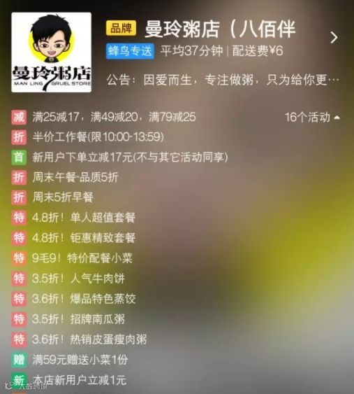 做外卖,满减是必要的促销手段,曼玲粥店也不例外。