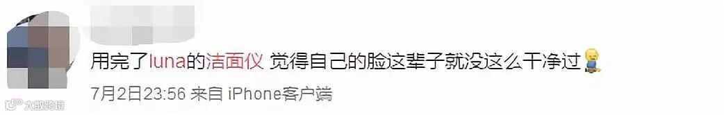 “洗脸界的iPhone”,轻松震走99.5%的皮肤污垢。许多用户第一次使用这款产品就能即时感受到效果,网上看到有人评价称,使用Luna洁面仪后,18年来才第一次有了洗脸的感觉。