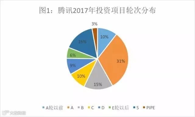 从投资轮次上来讲,腾讯A轮项目占31%,加上A轮以前的项目,占整个投资总比的41%。E轮以后的项目只占项目总数的25%。