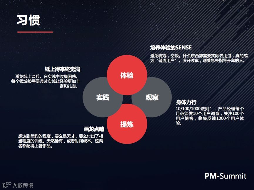 习惯是除了心态之外第二重要的,具体而言包括体验、观察、提炼、实践。