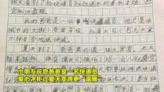 “夏天到了,爸爸黑的像一块大黑炭,天气越来越热,体育课我们操场上站一会儿就觉得昏天黑地,一想到爸爸每天都要这样送快递就觉得心疼不已。我的同学都说长大了要当科学家和医生,我想当快递员,帮爸爸一起送快递。