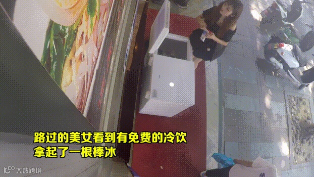 小姐姐拿出冰棒后看到旁边的告示牌后