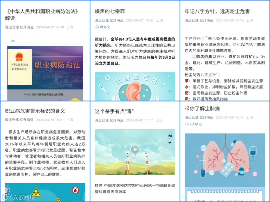 为认真贯彻党中央、国务院和中远海运关于职业病防治工作的决策部署,进一步推动落实职业病防治工作主体责任,切实保障广大劳动者职业健康权益,亿升海运通过开展系列宣传教育活动,普及职业病防治知识,营造职业病防治的浓厚氛围。