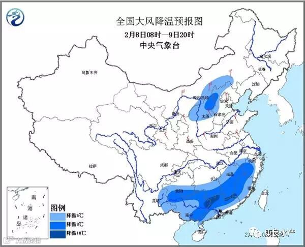 随着雨雪的脚步,冷空气带来大风、降温也不甘示弱,南方气温将猛跌。中央气象台预计,受寒潮影响,我国中东部大部地区自北向南将先后出现大范围大风降温和雨雪天气,平均气温将普遍下降4℃以上,其中,山西东北部、贵州南部、湖南南部、江西中南部、浙江西南部、福建西部、广西北部和东部、广东北部等地气温将下降8℃以上,局地超过10℃。长江以北地区并伴有4~6级偏北风,东部和南部海区风力有6~8级。中央气象台于今天06时继续发布寒潮蓝色预警。