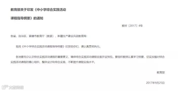 2017年10月,教育部发布《中小学综合实践活动课程指导纲要》,《指导纲要》提出中小学综合实践活动课程是义务教育和普通高中课程方案规定的必修课程,与学科课程并列设置,从小学到高中,各年级全面实施,所有学生都要学习,都要参加。其中,编程被明确列为综合实践活动课程内容之一。