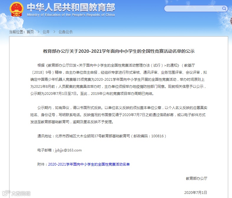 教育部公示及赛事清单网址链接:http://www.moe.gov.cn/jyb_xxgk/s5743/s5745/202007/t20200701_469571.html