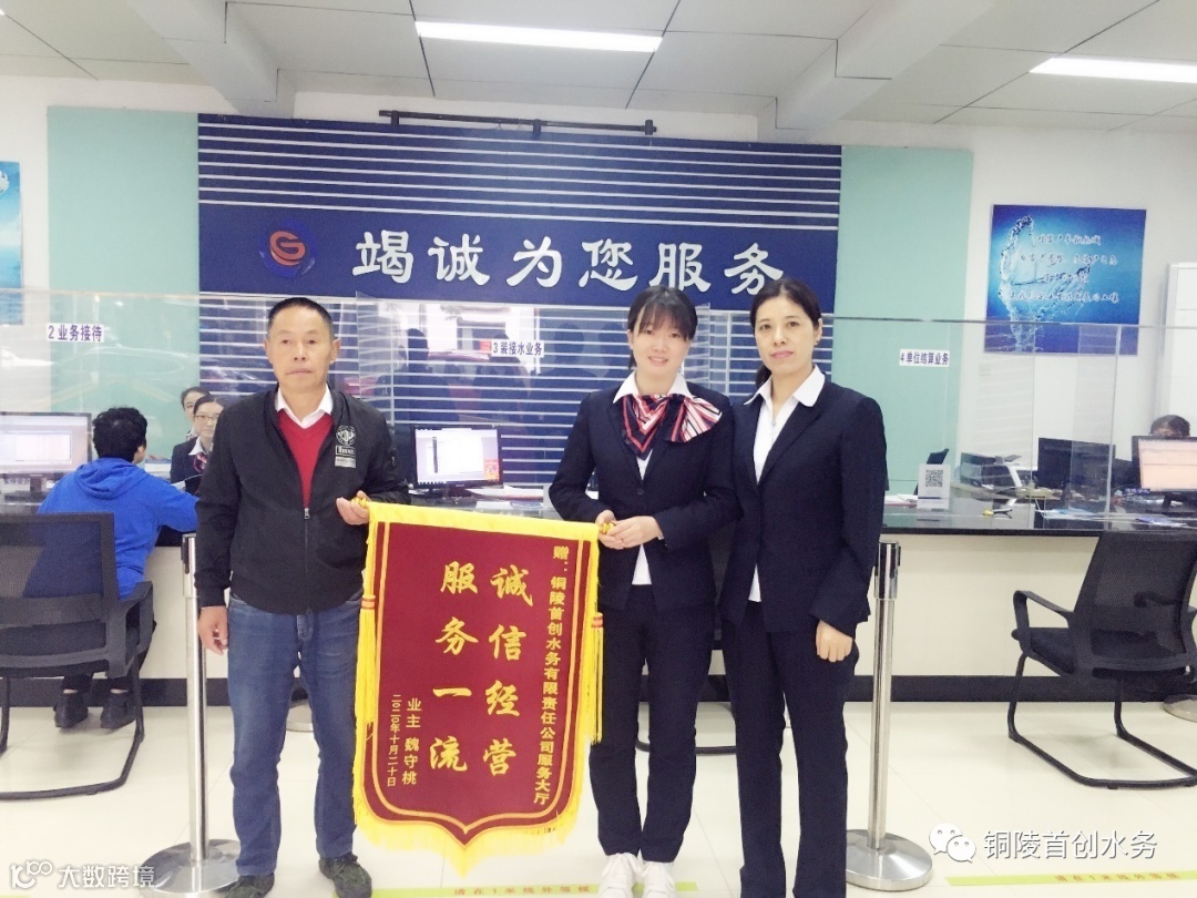 小小锦旗,凝聚着用户对铜陵首创水务客服工作的鼓励和认可。作为对外服务的窗口,铜陵首创水务公司供水服务大厅将始终坚持“用水沟通 用心服务”的服务理念,把供水企业对用户的承诺送到用户家中、送到用户心头。