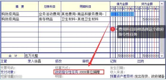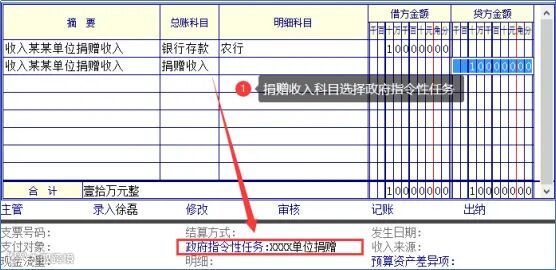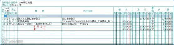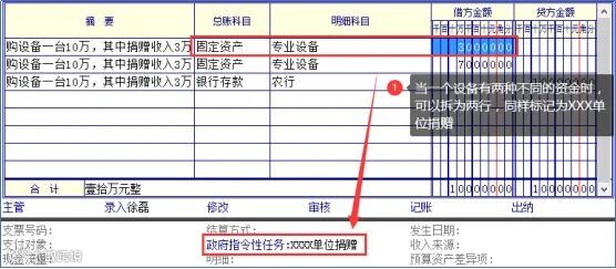 3、如果是购入固定资产,也可以把固定资产科目勾上政府指令性任务,方法同上。如果是购入的固定资产中,用了一部分钱是捐赠收入的,固定资产分录可以拆分为两行,如下: