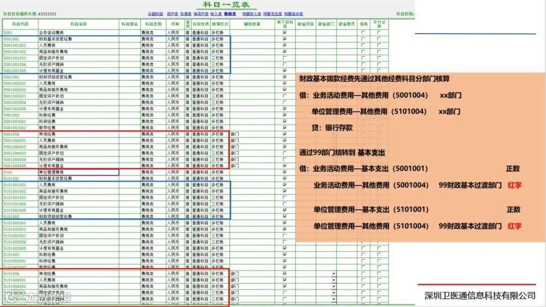 由于新的会计制度要求把财政基本支出单独分出来做账,要反映财政基本补助收入和财政基本补助支出。而财政基本补助支出也是需要做成本核算的,如果按制度要求,那必须把财政基本补助支出也按部门核算,这样就非常复杂。比如工资表,那就要把每个人的工资也分出一部分是财政的钱,一部分是自己的钱,这就没办法做了。因此我们在设置科目时,财政基本补助支出就没有设置部门,只把其他费用设置了按部门核算,也就说医院所有的费用,先全部进5001004其他费用,相当于是全部进了成本核算。对于财政的钱,我们把财政拨来的钱视同于已用完了(实际上一般也没有余额),就做一个调账凭证从其他费用中把这笔钱转到财政基本补助费用中。但为了成本核算方便取数,所以就增加了一个99部门来中转,这样把数据调过去了,也不影响成本核算。