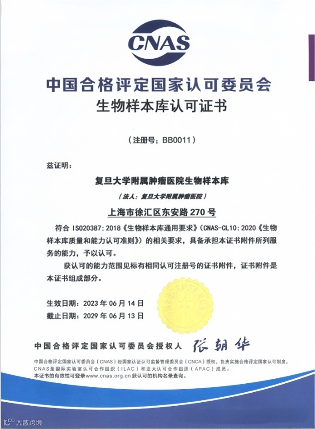 2023年6月14日,FUSCC生物样本库通过评审,获得中国合格评定国家认可委员会(CNAS)颁发的生物样本库认可证书。2025年6月12-14日,CNAS对其开展复评审工作,评审组专家通过文件与体系审核、现场操作验证、样本与存储核查、用户反馈征集以及全流程与全要素审查等多个维度,对生物样本库进行了全面深入的符合性验证。评审范围涵盖从患者知情同意书签署的规范性,到样本分装操作的合规性,再到样本DNA提取浓度及纯度的达标情况等各个环节。评审组认为FUSCC生物样本库质量管理体系运行良好,样本保藏活动符合认可准则。管理层重视体系建设,通过内审管评等措施,促进各方对体系的理解,持续改进体系运行。此次复评审通过,表明其质量和能力持续符合CNAS高标准,为国内肿瘤生物样本库建设提供重要示范。