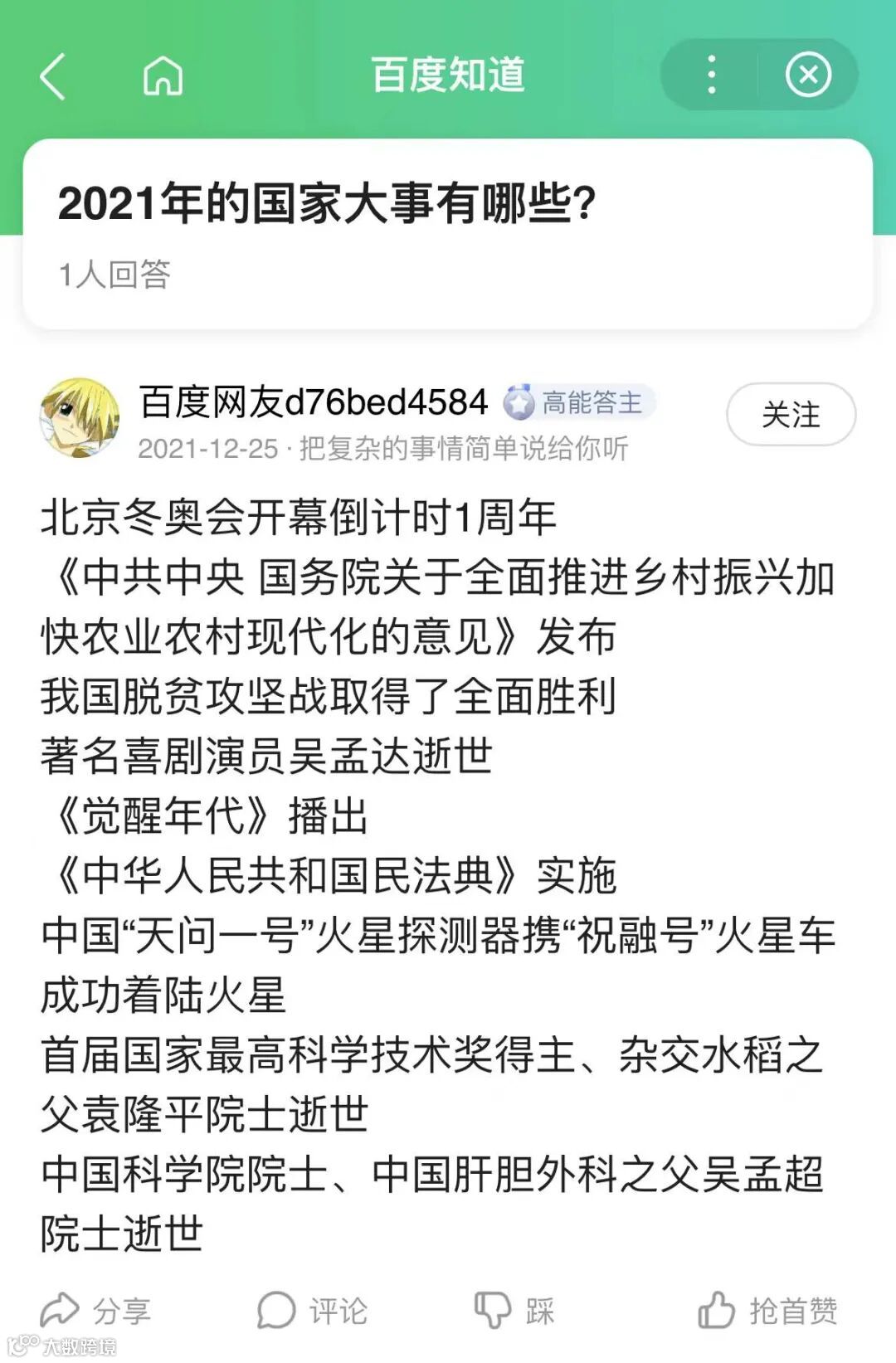 作为走心的年终盘点,百度知道《请回答2021·中国骄傲》年度问答活动,让我在岁末重温了属于2021年激动而骄傲的瞬间,积蓄2022新年力量。