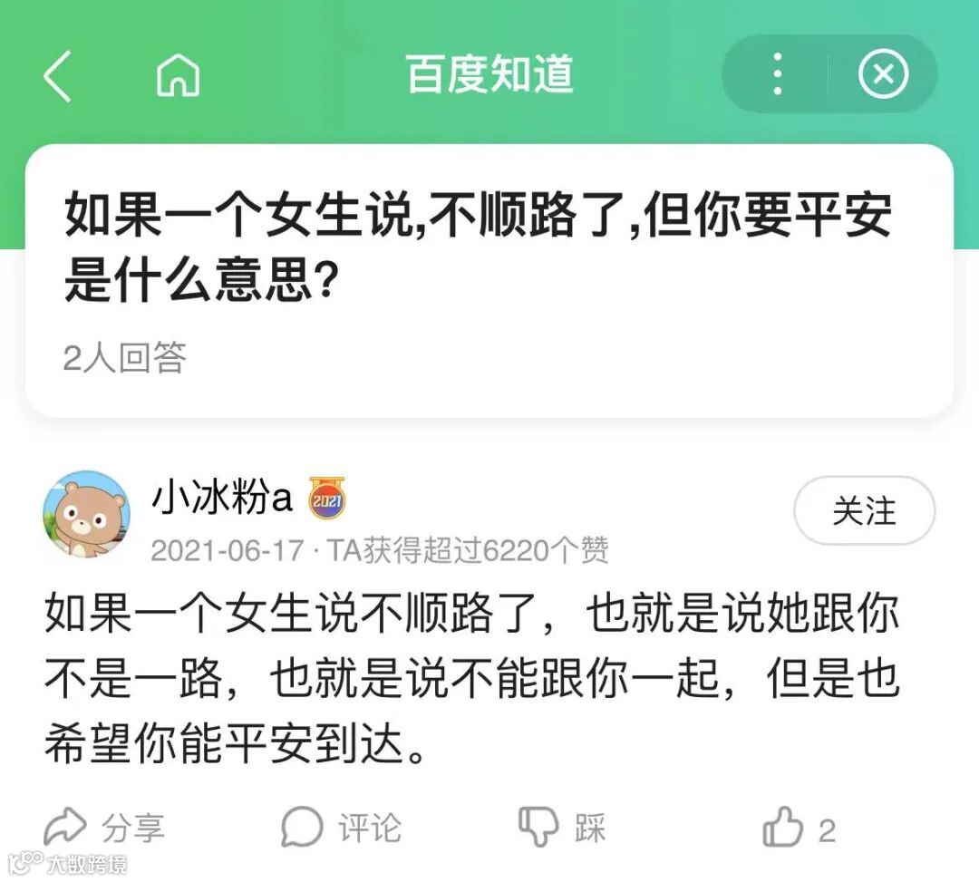 如果一个女生说不顺路了,也就是说她跟你不是一路,也就是说不能跟你一起,但是也希望你能平安到达。