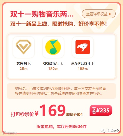 影森文化双十一来袭,百度文库联合会员推出了一款重磅新套餐,再次刷新了热门平台会员的底价,有需要的小伙伴不要错过哦!