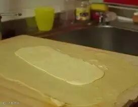 2. 将面赶薄至马琪琳三倍大小,将马琪琳放到面片上。