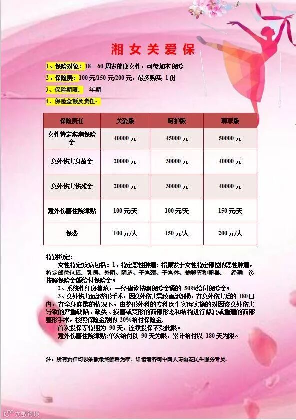 为提高广大女性抵御疾病风险的能力,针对女性特定疾病、意外伤害、伤残,意外伤害住院推出了一系列险种,辖区内18-60周岁健康女性均可参加投保。