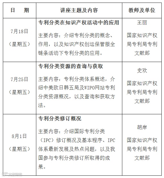 专利文献馆2025年7-8月公益讲座计划:“专利分类与应用”专题