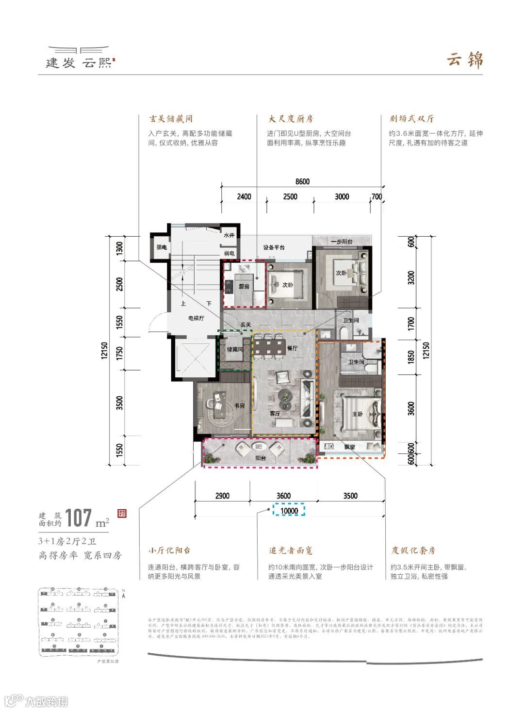 建发·云熙,洞察未来空间需求趋势,以全四房改善格局设计,实际使用率超90%(实际使用率计算:实际使用面积/销售面积),创新独立储藏室,多重收纳体系,双厅一体化,最高三阳台+双飘窗(建面约133㎡户型)……未来10年甚至20年,不用换房,在良渚很难找出第二个。