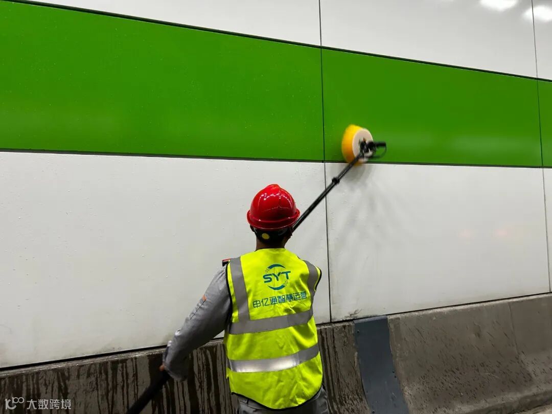 保洁小组利用电动毛刷、抹布、清洁剂等对侧壁顽固污渍、卫生死角处开展二次清洁,通过“精细化”养护,提升隧道清洁度,增加了隧道行车的安全和市民的行车舒适感。