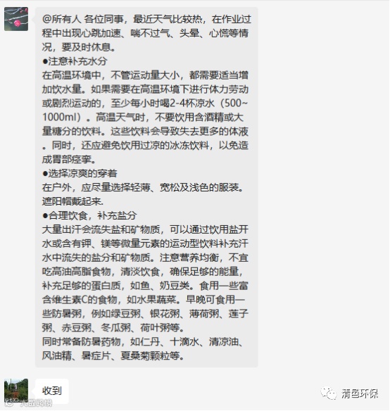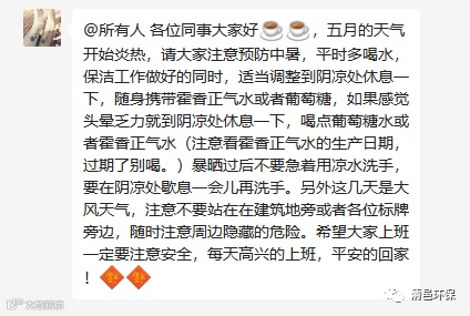 ,为公司员工准备了矿泉水和藿香正气水、清凉油等防暑药品,并且在各个工作群里文字形式提示各位员工注意防暑防晒,科普防暑解暑知识等。