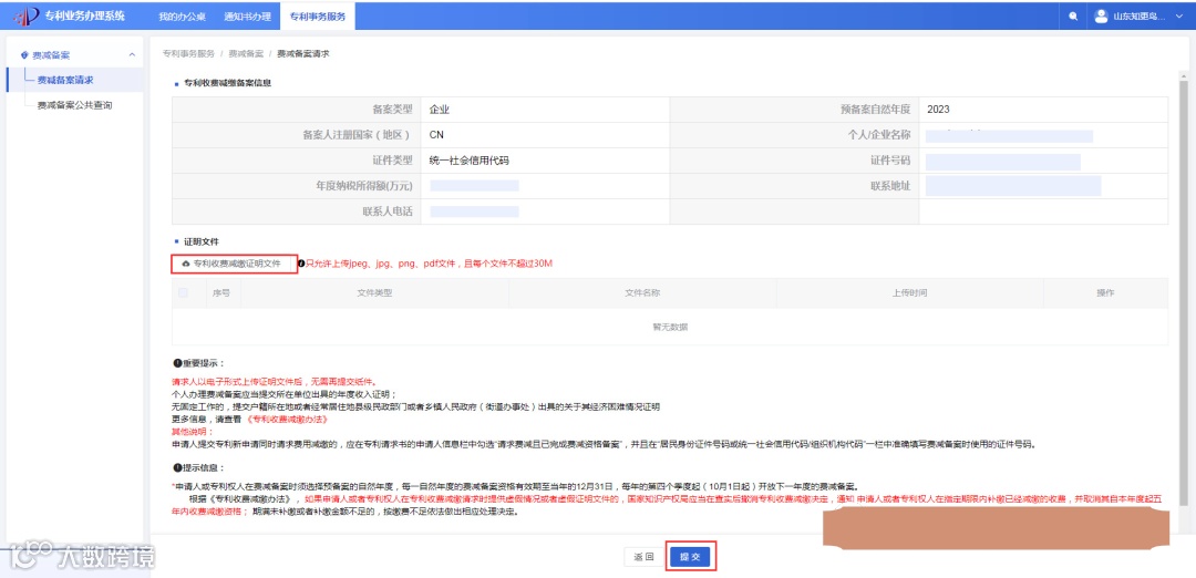 6. 选择”专利收费减缴证明文件”上传后提交即可