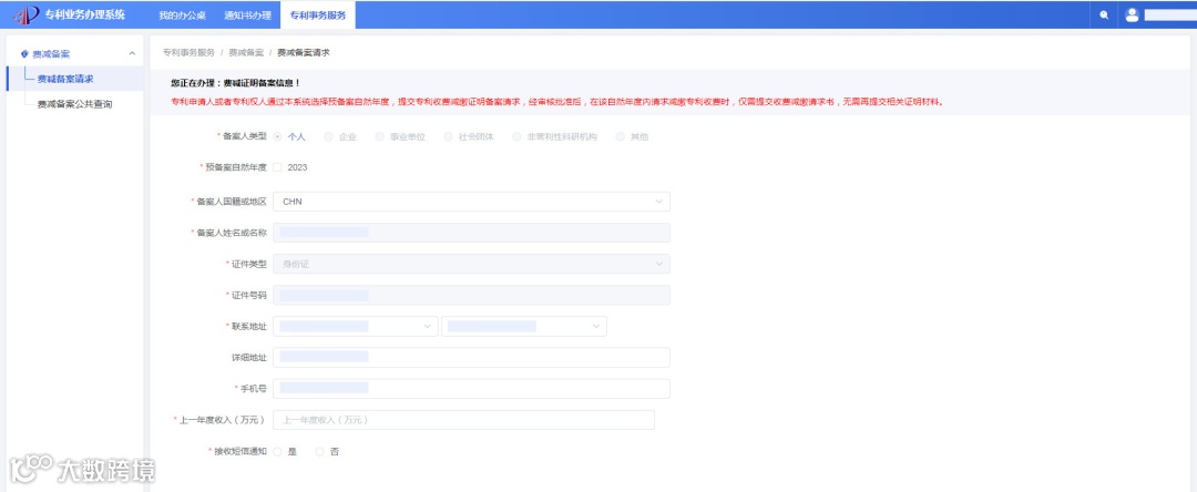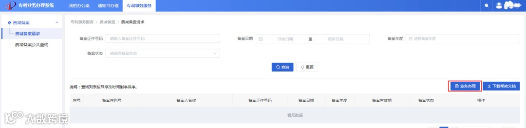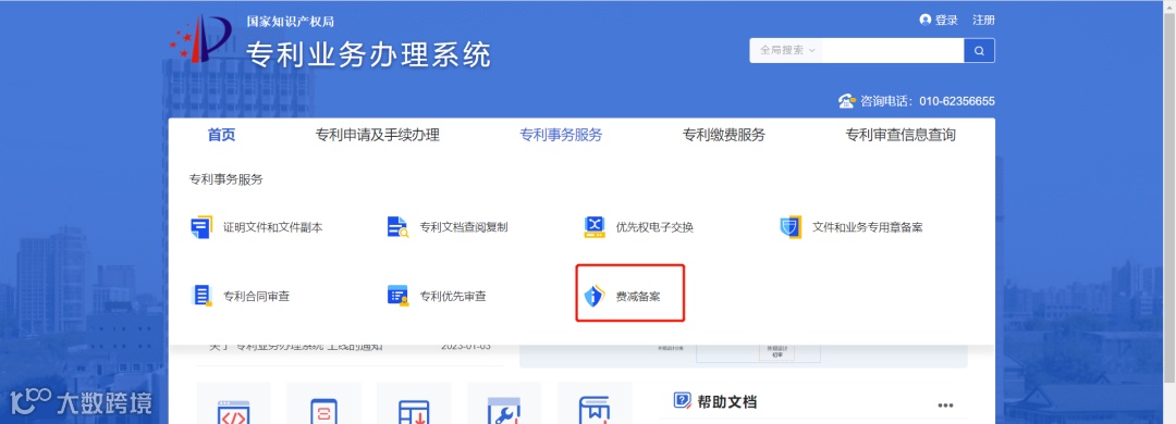 3. 鼠标放置于“专利事务服务”上,点击“费减备案”