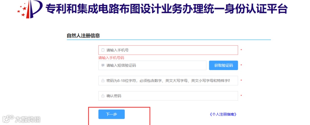 如经办人没有个人账号,选择未注册输入对应信息点击提交即可注册成功。