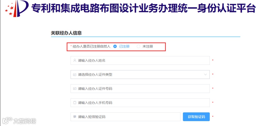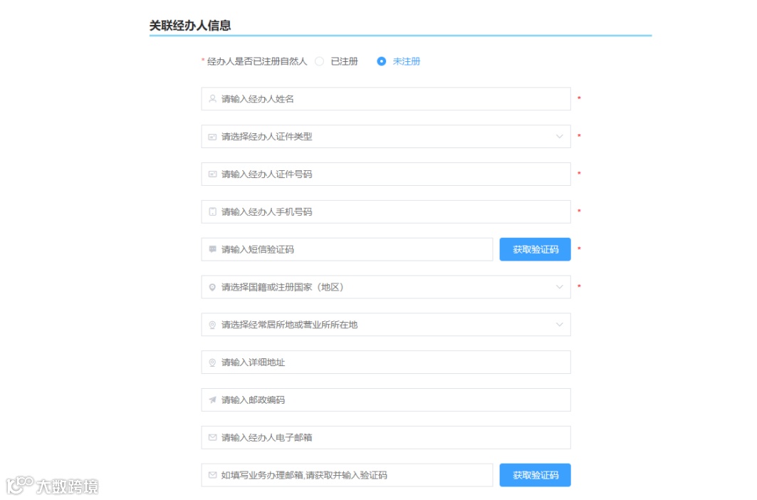 最上方经办人是否已注册自然人:如经办人有个人账号,选择已注册输入注册信息点击提交即可