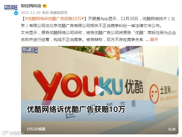 近期,优酷网络技术(北京)有限公司与北京优酷广告有限公司相关不正当竞争纠纷一审法律文书公布,判决优酷广告在30天内变更企业名称,停止使用“优酷”字样,并在媒体上公开刊登声明消除影响,以及赔偿优酷网络经济损失10万元。