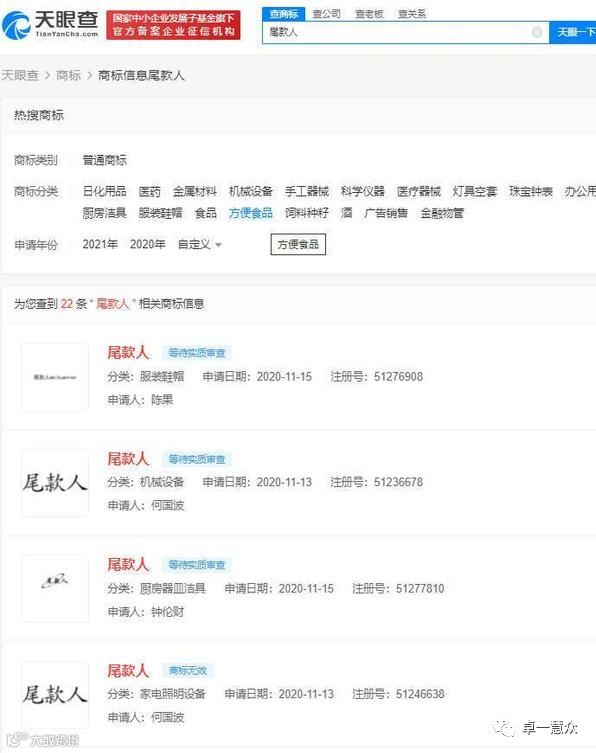 天眼查显示,从2020年开始,“尾款人”商标已被多个公司及自然人抢注,现有20多条申请信息,国际分类包括广告销售、方便食品、服装鞋帽等。其中,多个商标被驳回,状态已显示为“商标无效”。目前,尚无“尾款人”商标注册成功。