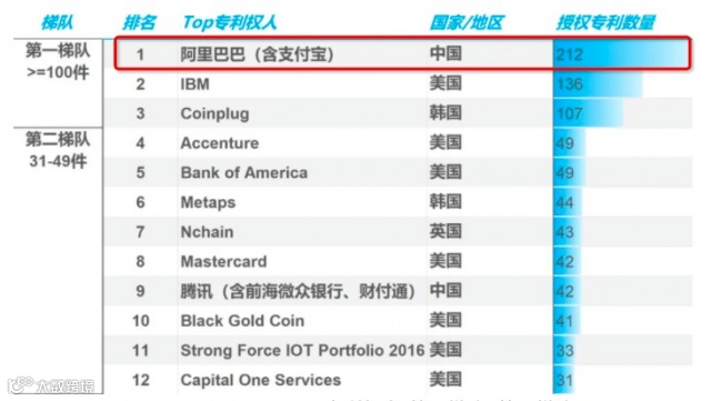 报告显示,全球已获得授权的区块链专利排名中,支付宝以212件区块链授权专利数位列全球第一,第二、三名分别为IBM(136件)和Coinplug(107件)。
