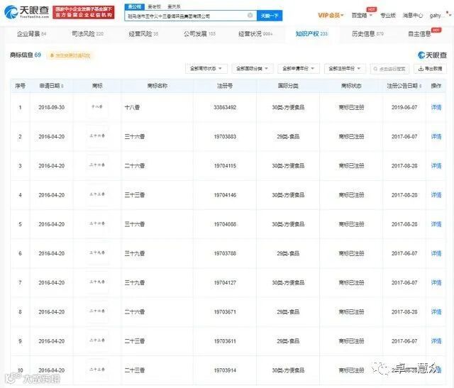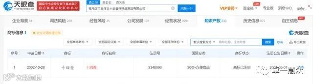 天眼查App显示,“十四香”商标已被驻马店市王守义十三香调味品集团有限公司成功注册,其申请时间为2002年,国际分类为方便食品。截至目前,王守义公司已成功注册“十二香”至“十八香”商标,以及“二十三香”“二十六香”“三十六香”“三十九香”商标,国际分类多为方便食品、食品。