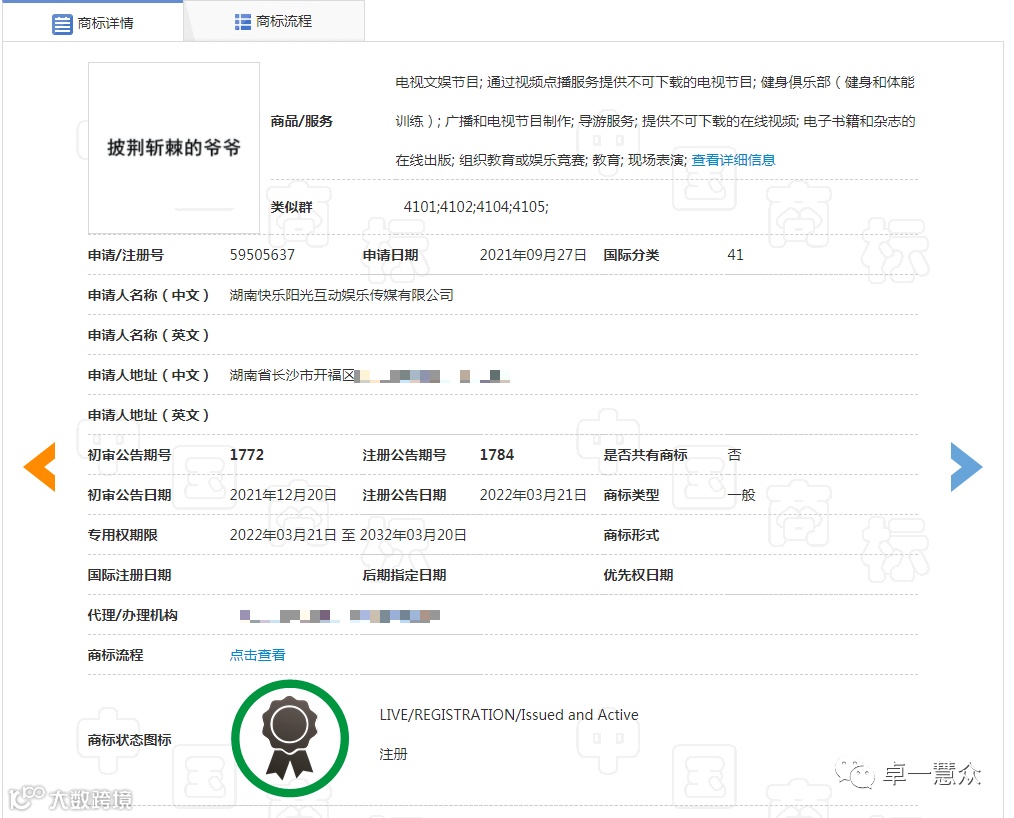 据商标局官网显示,湖南快乐阳光互动娱乐传媒有限公司在2021年9月27日申请注册了“披荆斩棘的爷爷”商标,并于2022年3月21日注册成功。怀着好奇心,小编还发现,芒果TV似乎是把每一档收视火爆的节目都注册了商标,如“乘风破浪”,“披荆斩棘”,“明星大侦探”,“大湾仔的夜”等,而且几乎都是注册了多类别。