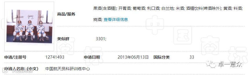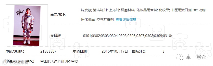 此前,中国航天员科研训练中心将杨利伟的签名照申请注册成图形商标,申请日为2003年10月17日,保护类别为全类保护。2013年中国航天员科研训练中心又将聂海胜、张晓光和王亚平签名形象照注册成商标。