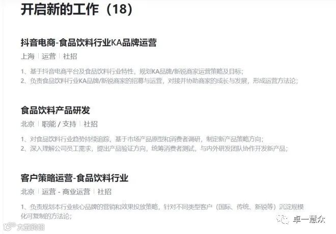在字节跳动的官网上可以看到,字节跳动于近期在北京组建食品饮料团队,并且在官网招聘栏目中,已有包括食品饮料产品研发和策划等岗位。岗位中明确提到了“梳理核心卖点和产品上市计划,并负责落地实施”,这意味字节的食品饮料业务或许并不局限于内部的供应和售卖,仍希望进军外部市场。