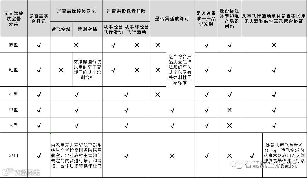 《条例》将无人驾驶航空器分为微型、轻型、小型、中型、大型和农用六类,在设计生产、操控人员要求、飞行空域划设、飞行活动规范等方面,既明确了一体遵守的规则,又规定了差异化的监管要求,以更好地适应实际情况。