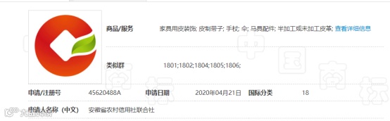 因认为安徽省农村信用社联合社的一枚图形商标(第45620488A号)与其商标近似且侵犯其著作权,在该商标公告期内,中国建设银行股份有限公司对其提出异议请求。商标局审理认为:被异议商标指定使用商品与异议人引证商标核定使用服务不属于类似商品或服务,因此双方商标未构成使用于类似商品或服务上的近似商标。但被异议人将与异议人享有著作权的作品相近似的图案作为商标申请注册,已构成对异议人著作权的损害,故商标局决定:第45620488A号“图形”商标不予注册。小编查询,目前该枚商标进入不予注册复审流程。