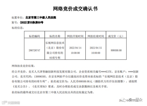 京东司法拍卖平台信息显示,4月15日,乐视网信息技术(北京)股份有限公司持有的85项专利经过1天的拍卖,最终以89.95万元的价格成交。